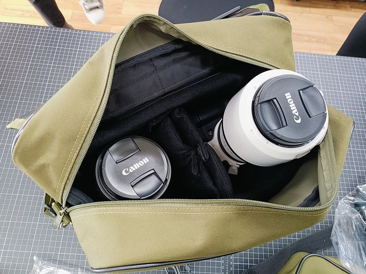 カメラ用のクッション材入りバッグインバッグと組み合わせれば、野外で直置きできる使い勝手の良いカメラバッグに変身。