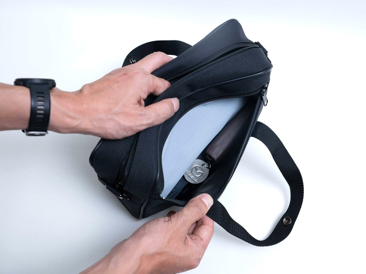 広島生まれのロードスターが中央重心でコーナリング性能を高めたように、このバッグはショルダーベルトの付け根を中央に据えることで、前後に力を均等配分。開口部が驚くほど広がりやすい設計に。